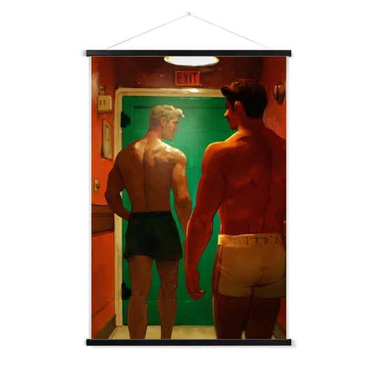 Atmospheric illustration by Ego Rodriguez featuring two muscular figures in a warm, dimly lit hallway, heading toward a green exit door. The artwork exudes a sense of mystery and intrigue, with its rich color palette and dynamic lighting. Perfect for adding depth and narrative to your space, this piece is available as high-quality prints in multiple sizes. Ideal for collectors and fans of contemporary, queer-inspired art. Explore more captivating creations by Ego Rodriguez in our shop!