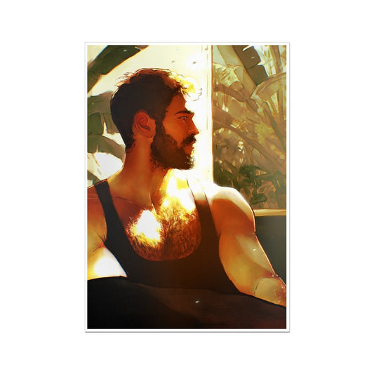 Illustration by Ego Rodriguez featuring a serene moment captured in golden sunlight. This evocative artwork depicts a bearded man with a contemplative expression, seated near lush greenery, bathed in a warm, natural glow. Perfect for adding a touch of tranquility and sophistication to any space. Available as high-quality prints in various sizes. Ideal for art collectors and fans of contemporary, queer-inspired illustrations. Browse our collection for more unique designs!